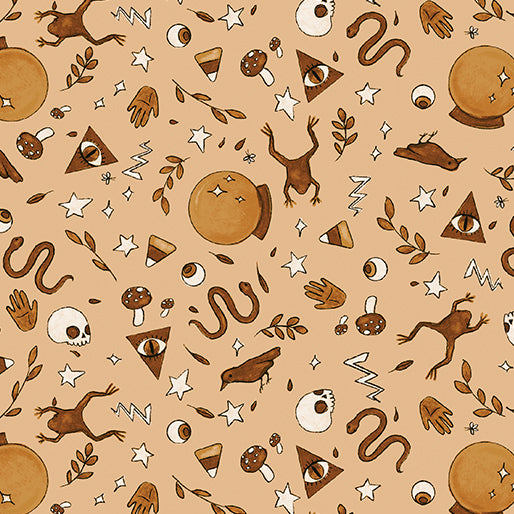 Step into a world where magic and nature intertwine with the Spellbound collection by Marin Sutton. This unique fabric line features whimsical witchy elements like charming frogs and mystical crystal balls, seamlessly blended with organic motifs of winding vines, enchanting mushrooms, and slithering snakes. The color palette is a harmonious mix of modern and muted hues, including serene blues, warm oranges, earthy greens, and soft blush tones. Perfect for creating spellbinding quilts, captivating garments, and enchanting home decor, this collection brings a touch of magic to every project.