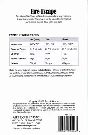 Bring the drama of iconic fire escapes from musicals like "West Side Story" and "Rent" into your home with this vibrant quilt pattern. This design features a striking array of orange, red, and brown hues, creating a dynamic zigzag pattern that captures the essence of urban architecture. Perfect for adding a touch of theatrical flair to your living space, this quilt can be made in lap, twin, or queen sizes, requiring five 1-yard cuts of fabric for the lap size. The pattern includes detailed instructions for assembling this eye-catching piece, making it a delightful project for quilters of all levels.