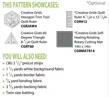 Hexies Go Round All you need is thirty-six 2-1/2" strips and the four B's, background, borders, binding and backing to create this colorful quilt. The pattern includes instructions showing how to sew these hexies, log cabin style, to create the movement in the quilt. The center hexies are cut with the Creative Grids Hexagon Trim Tool and then trimmed after the colorful bands are added. Don't you love it when you can learn a new technique as well? 60in x 68in. The Creative Grids CGRJAW4 and CGRT60 are required. The Creative Grids CGR412; CGR418; or CGRMT5 is recommended. Project Time: 6+ Hours. Fabric Type: Strip Friendly. Project Type: Quilt.