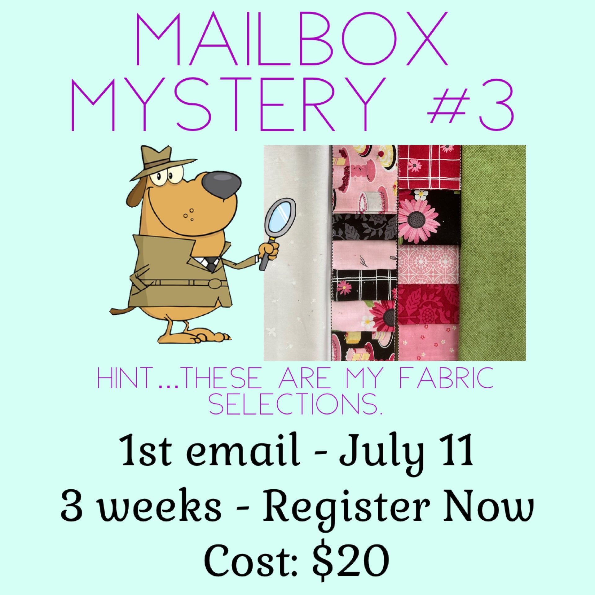 NEW MYSTERY QUILT!! Whether this will be your 1st or 100th mystery quilt, you are sure to have blast when you join Kelly on a quilting adventure! For those unfamiliar with a Mystery Quilt, you will be given a supply list and your first clue...the cutting instructions! And no, you won't get any more clues out of me than that (unless you are a super sleuth and have already recognized the true first clue)! The beauty of this Mystery Quilt is that there isn't any pressure! Each Friday beginning July 11, I will email you (get it? eMAILBOX MYSTERY!) the next "CLUE" aka step in the quilt. Each clue will have either a pictorial or video component to the email and I am available via email or in the shop for any questions. For the last "CLUE" you'll have THE BIG REVEAL!! At the end of adventure, you will either be mailed a hard copy of the pattern or you can pick it up at S&ST. Everyone who submits progress photos either via Facebook, email, or in the store will be entered to win a prize at the completion of the mystery! Nope, there’s no clue what that will be either! LOL The supply list will be emailed upon paid registration. This quilt measures approximately 40" x 47" and requires the following yardage. This is a FABULOUS stash quilt!!! (That might just be another sneaky clue...shhhh). (18) 2.5" x WOF strips of assorted prints; pictured in the center section in the photo Contrast...1/4 yard; the green pictured above. Background...1/2 yard (right side of photo); white fabric show in photo. Binding...3/8 yard Non-directional fabrics will be best. All fabrics have the potential to touch each other. Please be sure there is clear contrast between the background & contrast fabrics with relationship to each other and the strips. For example, there were strips in my pack that has white background . I chose to eliminate them as I am using a white tone on tone for the background of the quilt.