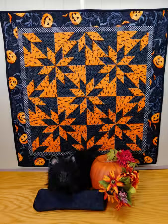 The Hunter’s Stars are created with just two high contrasting fabrics. The borders showcase the holiday theme. Since you only need 16 units to create the four-fourteen-inch star blocks, it goes together very quickly and makes a great table topper or back drop for your Fall display.