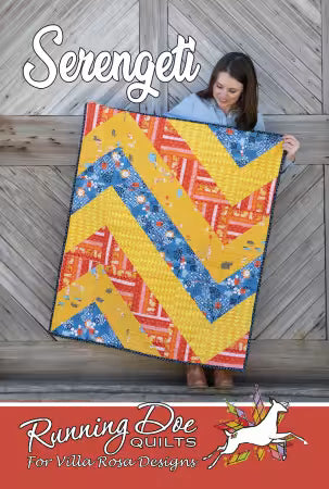 Discover the vibrant and dynamic Serengeti quilt, perfect for adding a burst of color to any room. This quilt measures 40 inches by 48 inches and is crafted using half yards of fabric, showcasing a stunning pattern of diagonal stripes in bold yellow, red, and blue hues. The design features a mix of intricate prints and solid colors, creating a lively and eye-catching effect. Ideal for both home decor and as a cozy throw, this quilt is displayed against a rustic wooden backdrop, enhancing its warm and inviting appeal. The bottom of the quilt is adorned with a playful Running Doe Quilts logo, adding a whimsical touch to this handcrafted piece.