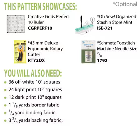 This quilt is made with 10-inch squares - and we all have some of those in our stash. Or, use the Perfect 10 Ruler by Creative Grids to cut your own. This throw is a generous 56 x 72 inches - the perfect size to add a Cuddle backing (the plush 60-inch wide backing that is sure to keep you warm on a cold, winter night).