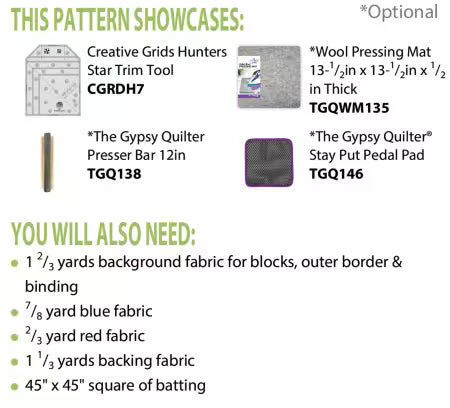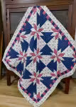 This Hunter’s Star accentuates the star design by using just three fabrics. The light and medium print stars glow when combined with a darker fabric. You only need 16 units to create the four-star blocks, and since the stars measure 16-inches, it goes together very quickly.