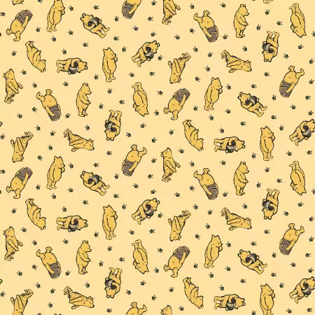 This delightful fabric features a playful design with multiple images of Winnie the Pooh in various poses, set against a soft, light yellow background. The charming illustrations of Pooh Bear, scattered with his iconic honey pots, create a whimsical and cheerful pattern that's perfect for crafting projects aimed at both children and adults who love this classic character. Ideal for quilting, apparel, and home decor, this fabric brings a touch of nostalgia and joy to any project.