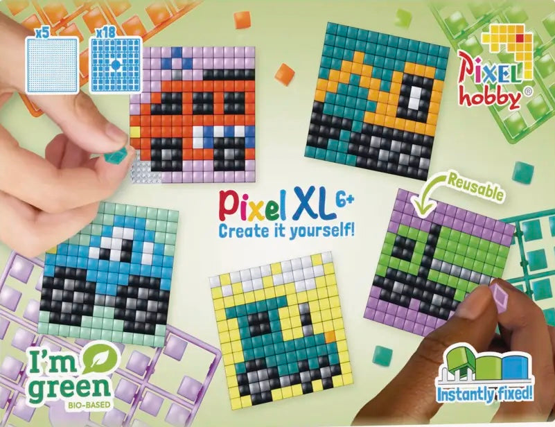 XL Theme Box is perfect for gift giving, a take along or rainy-day project, family craft night, and so much more. Appropriate for ages 6 & up. Pixel XL is a great multi-generational project as the larger pixels are easier for children's or adult hands. Pixel XL Theme Box contains (5) small baseplates, 18 XL pixel squares, and (5) patterns