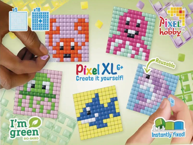 XL Theme Box is perfect for gift giving, a take along or rainy-day project, family craft night, and so much more. Appropriate for ages 6 & up. Pixel XL is a great multi-generational project as the larger pixels are easier for children's or adult hands. Pixel XL Theme Box contains (5) small baseplates, 18 XL pixel squares, and (5) patterns